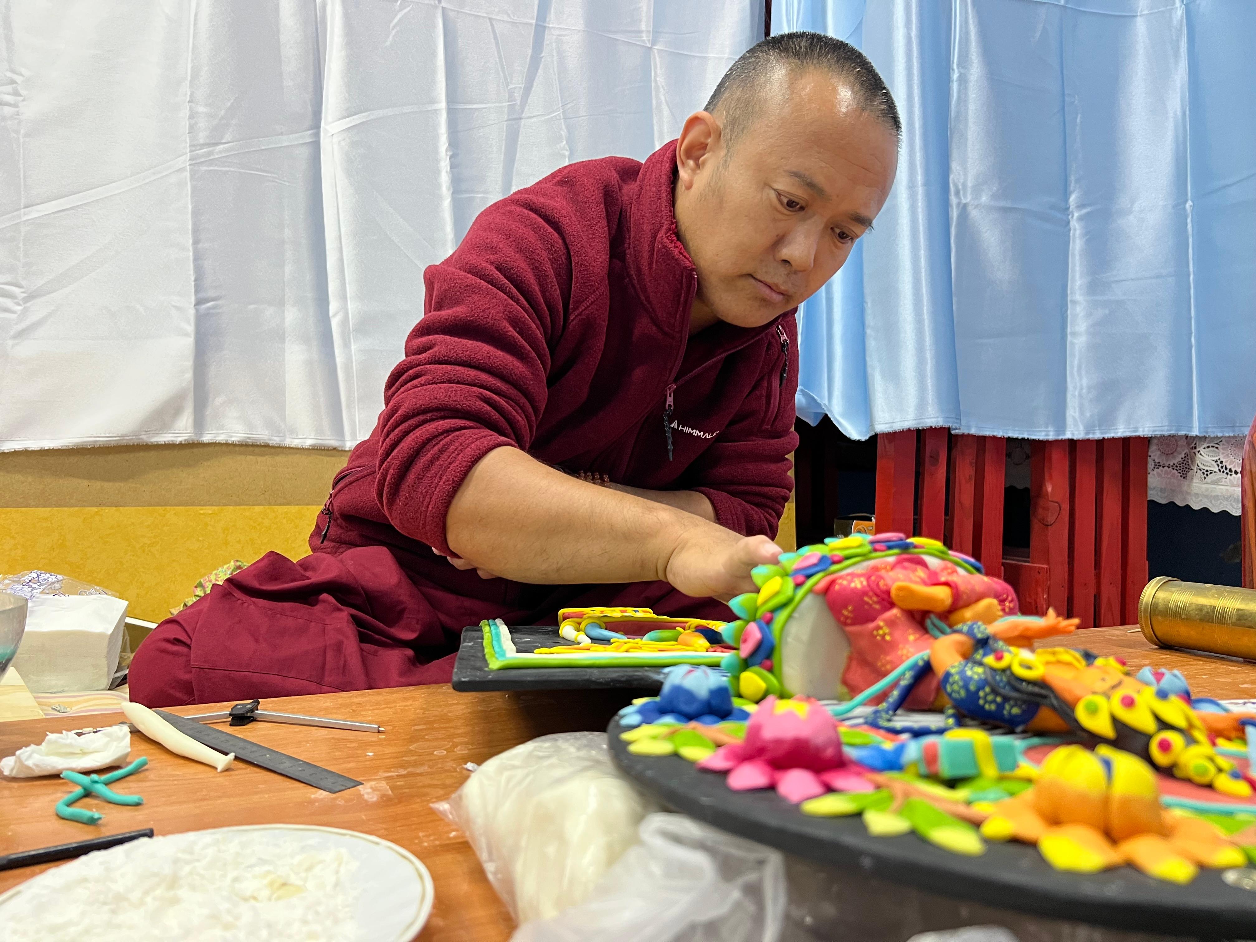 Сам геше-лхарамба Чой Гьяцо уже давно занимается созданием Торма. Это отдельный вид буддийского искусства. За плечами мастера огромное количество изготовленных подобных подношений.