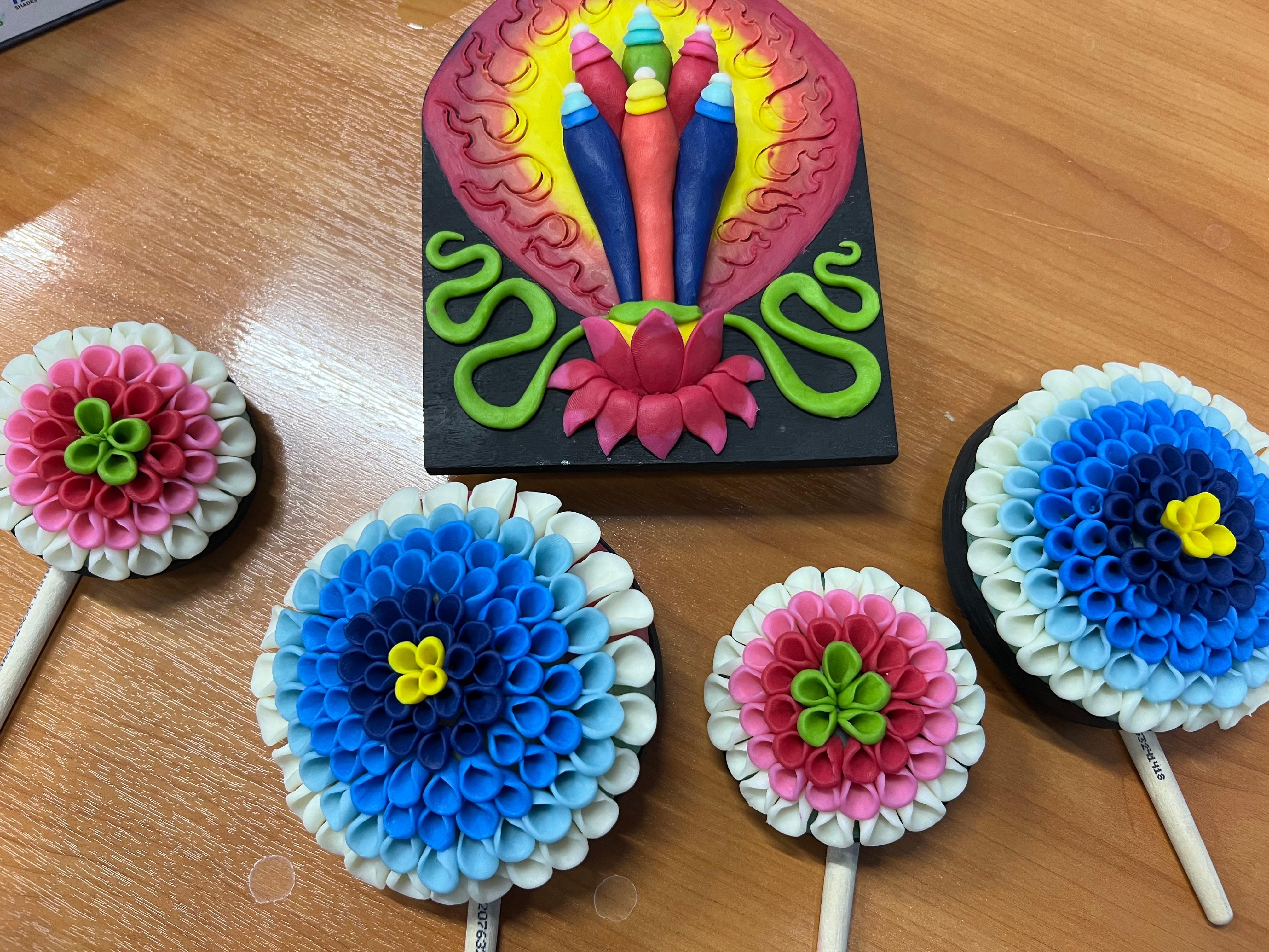 Изготовление каждой детали - очень кропотливый и трудоемкий процесс. Под умелыми руками мастера расцветают бутоны лотоса, в центре расположен бодхисаттва высшей мудрости - Будда Манджушри. При изготовлении этих Торма, которые в ближайшее время установят в большом молельном зале нашего храма, используется воск, топленное масло и специальные красители. Как отметил Учитель, важно соблюдать температурный режим, чтобы масло не таяло в руках он периодически охлаждает их в холодной воде.