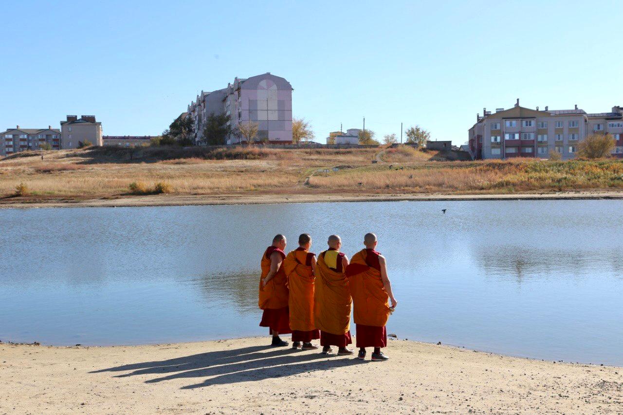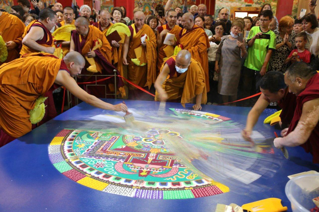 Легким движением рук в считанные секунды мандала была разрушена. Разделив собранный песок на две части, одна из которых была вывезена монахами к местному водоему (Колонский пруд), где провели соответствующий ритуал и предали песок воде. Это подношение Нагам и Хозяевам местности. Вторая же часть песка была раздана верующим после завершения сегодняшнего молебна.