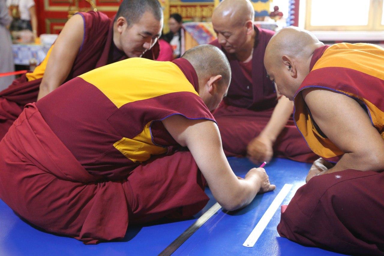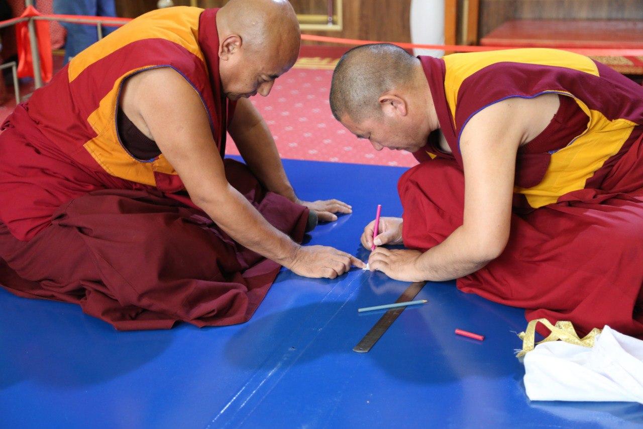 Сегодня монахи, во главе с досточтимым геше-лхарамба Тензин Сангпо Ринпоче занимались чертежом будущего дворца Зеленой Тары, ближе к вечеру приступили к основе.