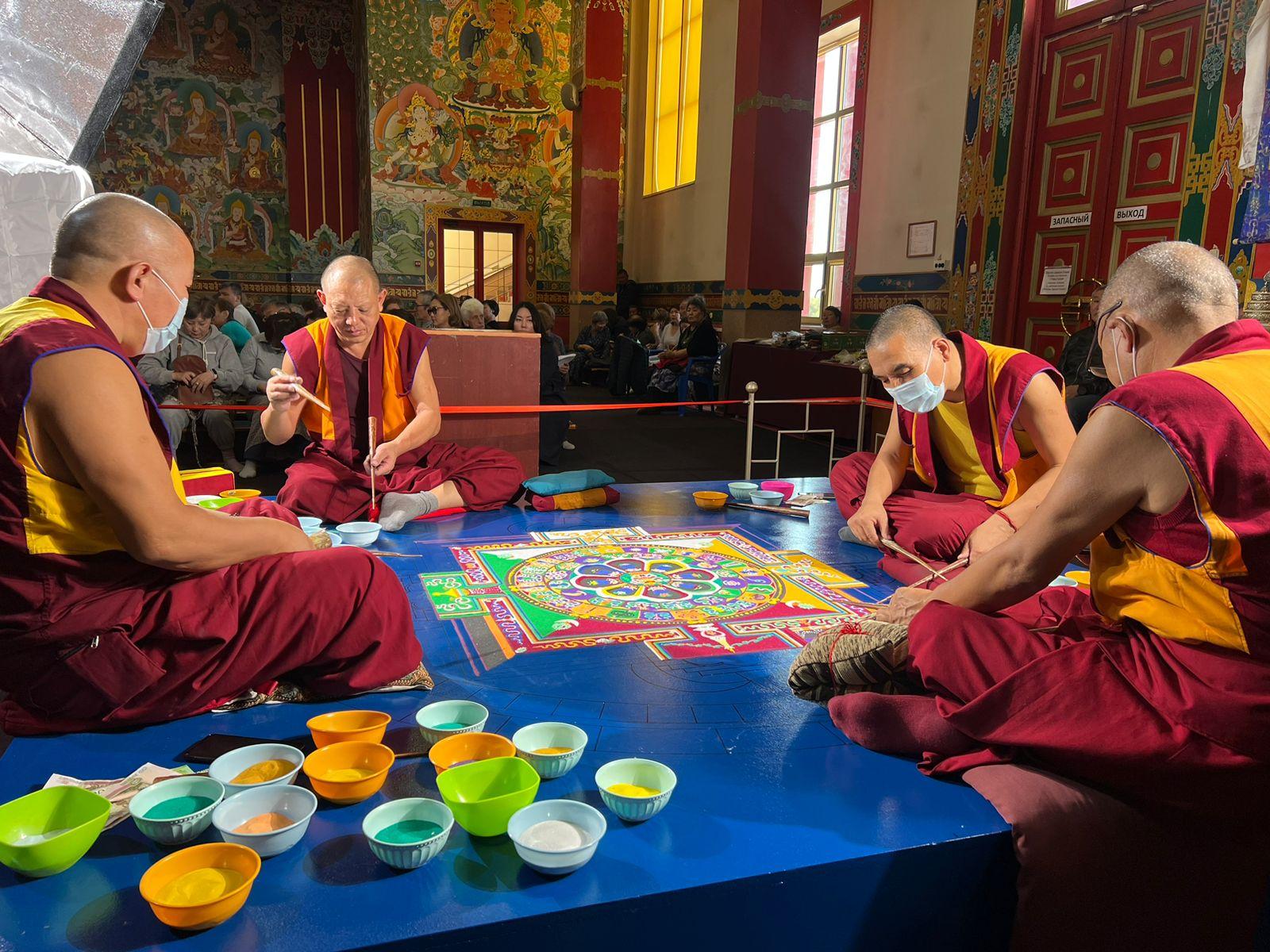 Параллельно с проводимыми в эти дни ритуалами в молельном зале Центрального хурула продолжается строительство песочной мандалы. Делегация монахов, прибывшая из монастыря Дрепунг Гоманг, с раннего утра и до позднего вечера возводит буддийскую святыню, посвященную Будде Медицины.