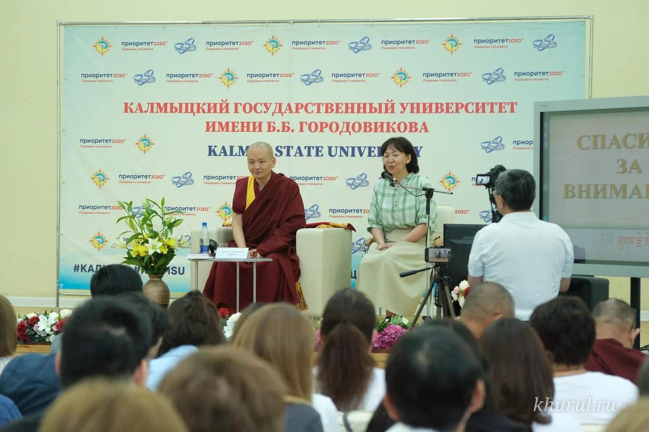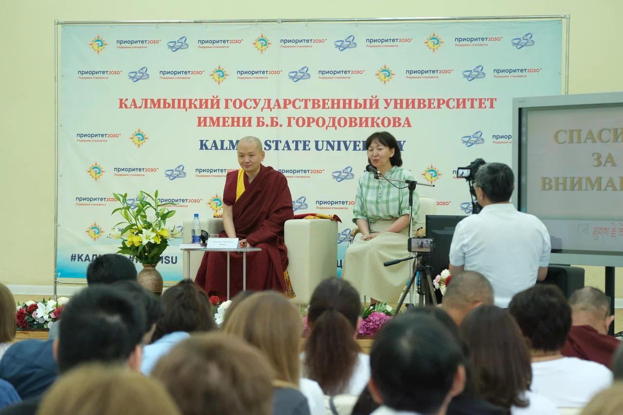 «В храме науки, где обучают и воспитывают молодое поколение, там где работает почти 1000 сотрудников, где учатся более 9000 студентов из более чем 50 стран, где в приоритете такие задачи воспитания, как миролюбие, доброта, милосердие, нам очень важно встречать сегодня в наших стенах высокого гостя, нашего досточтимого Кунделинга Ринпоче», - так начал встречу ректор Калмыцкого Государственного Университета Бадма Салаев.