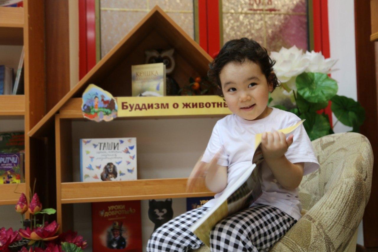 Это наш юный читатель библиотеки Центрального хурула. Галсану всего лишь 3, но ему очень понравился уголок с детскими книгами о буддизме, который недавно пополнился новинками 2023 года выпуска.