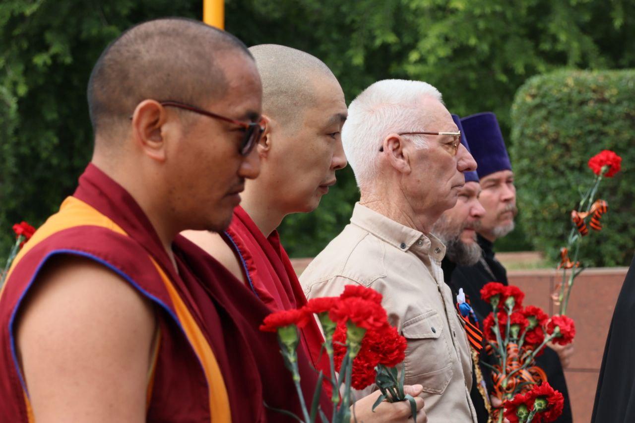 Накануне,Руководитель администрации Центрального хурула гецул Бадма с монахами «Золотой обители Будды Шакьямуни» и с другими членами Межрелигиозного совета Калмыкии почтили память погибших в годы Великой Отечественной войны, возложив цветы к мемориалу «Вечный огонь».