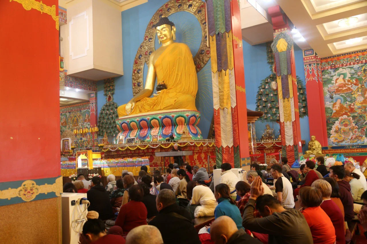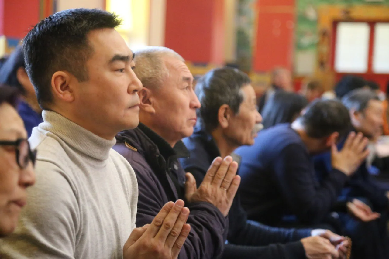 С самого утра в дугане многолюдно: звуки молитв, аромат благовоний, свет лампадок и,главное, — единство сердец тех, кто пришёл с чистыми помыслами. Здесь ощущалась особая благодать, монахи на протяжении нескольких часов возносили свои молитвы всем Буддам и бодхисаттвам, Защитникам Дхармы и, конечно же, отдельные восхваления предназначались Великому Учителю - Будде Шакьямуни. Верующие разных возрастов пришли сегодня в храм, и каждый нашёл здесь что‑то своё: покой, надежду, вдохновение.