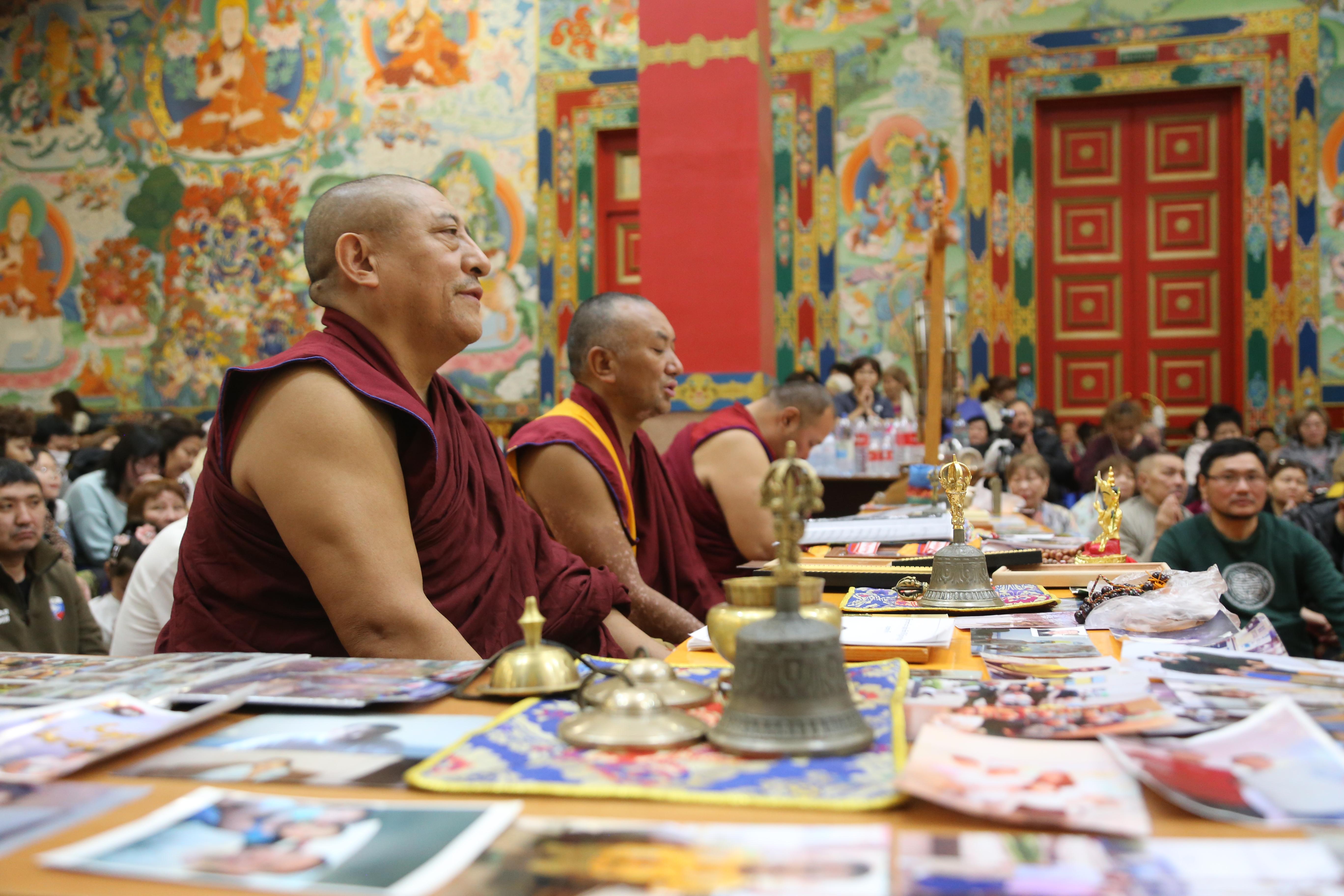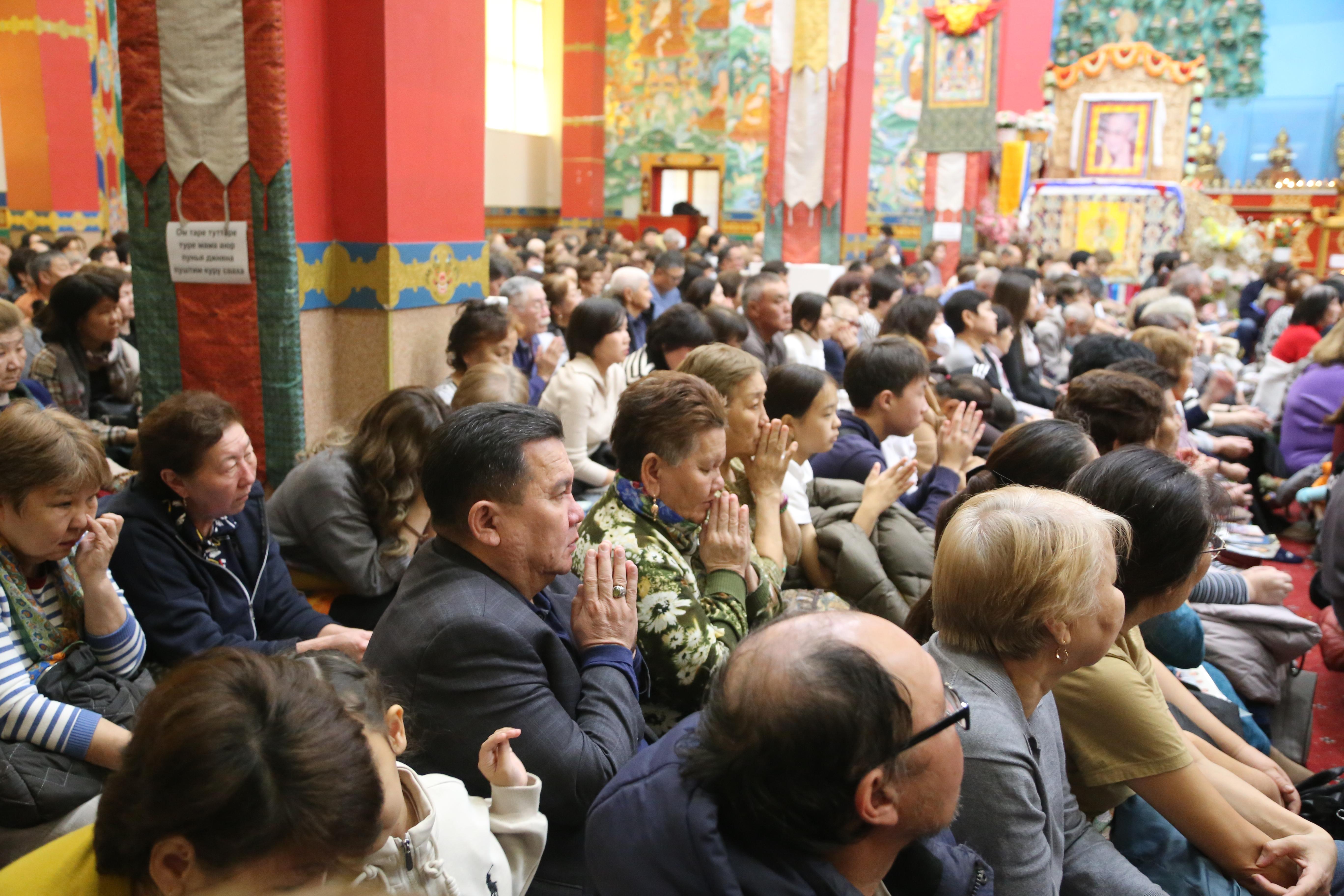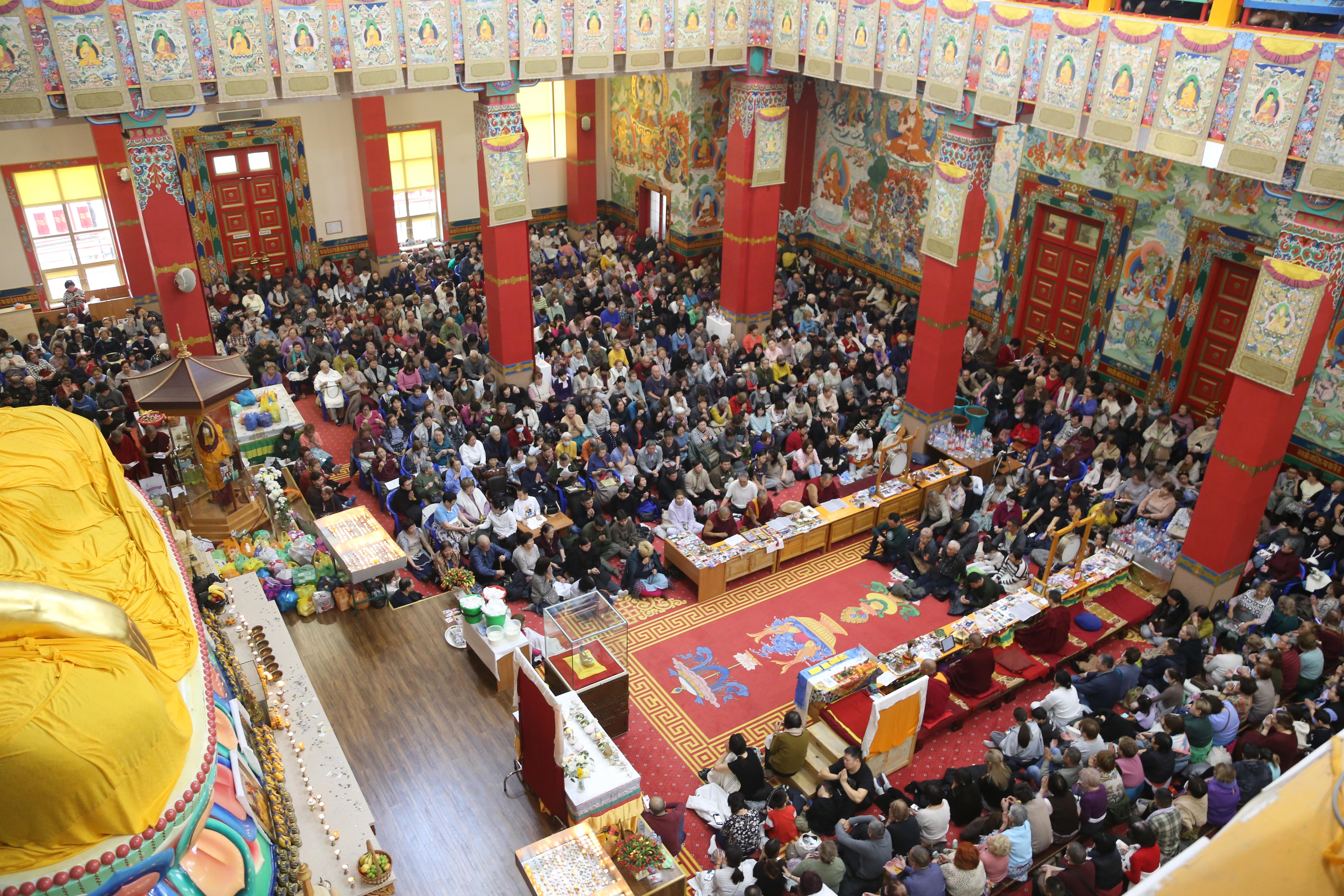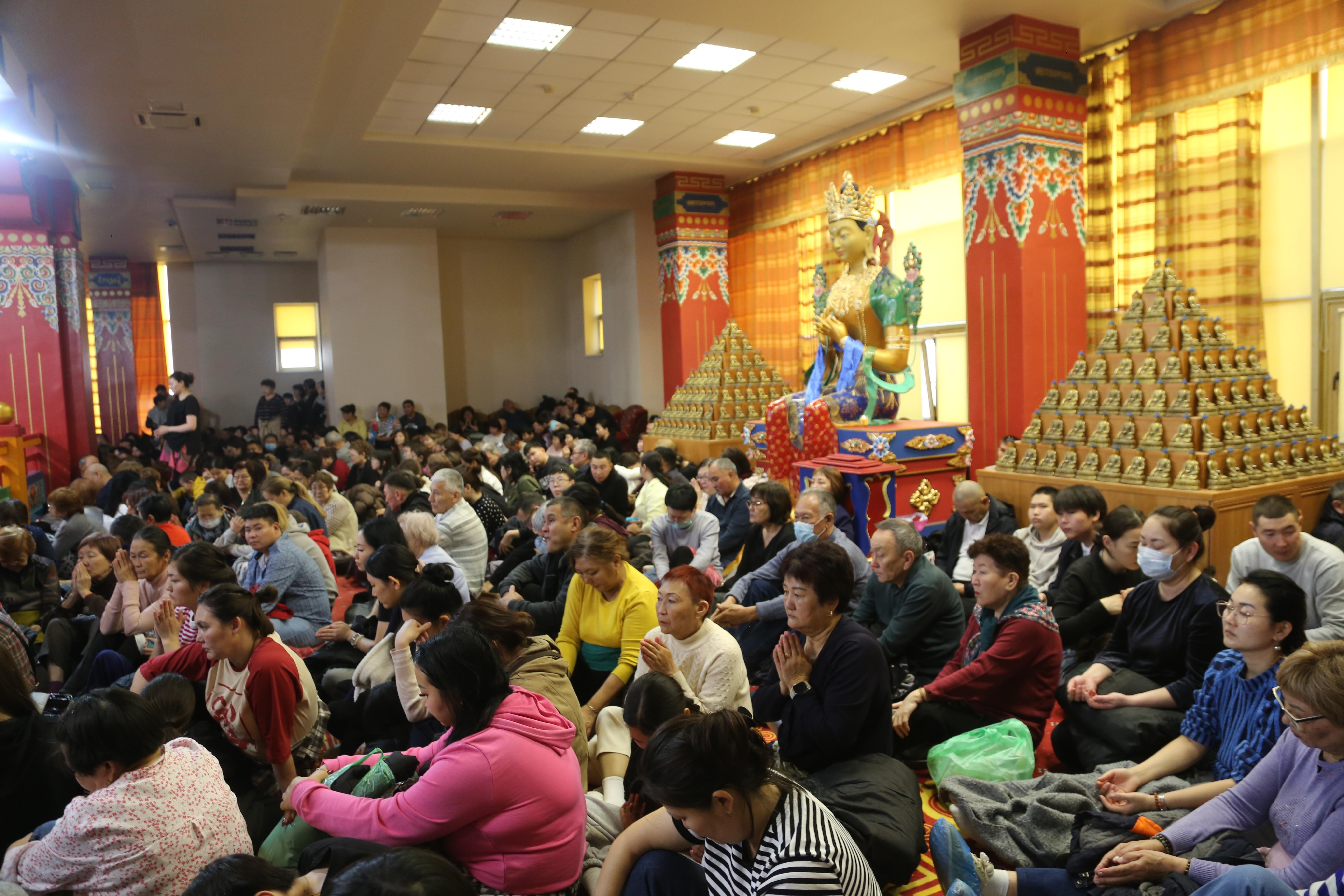 Сегодня в «Золотой обители Будды Шакьямуни» было многолюдно. Верующие расположились на всех трех уровнях, и на протяжении 2,5 часов проводился специальный молебен-обращение к богине долголетия Белой Таре. В завершении всех угостили, освященными во время ритуала, пилюлями и напитком долголетия.