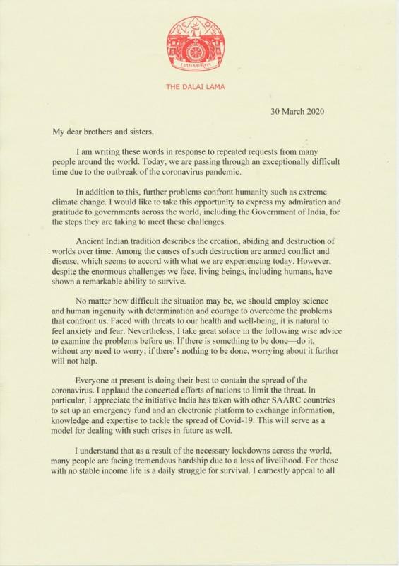 Специальное послание Его Святейшества Далай-ламы в связи с пандемией коронавирусной инфекции