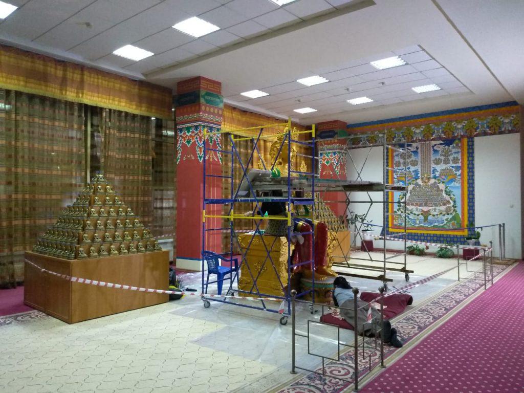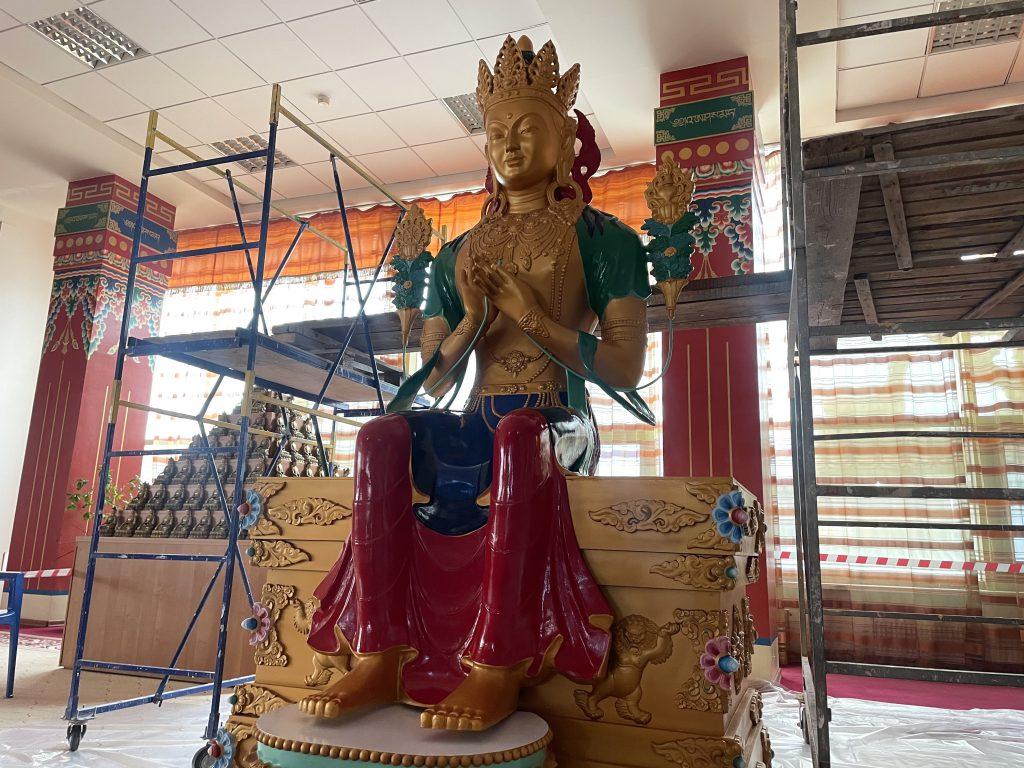 Сложная и кропотливая работа. В главном буддийском храме Калмыкии в эти дни танкописец Татьяна Музраева работает над росписью статуи Майтрейи, которую в прошлом году вручили хурулу в дар. В этом ей помогает мастер Амра Дорджи-Горяева.