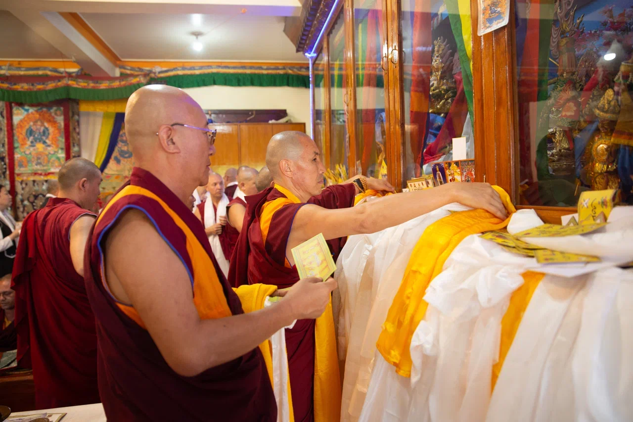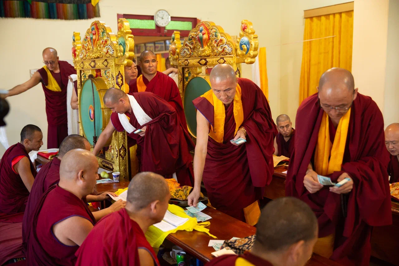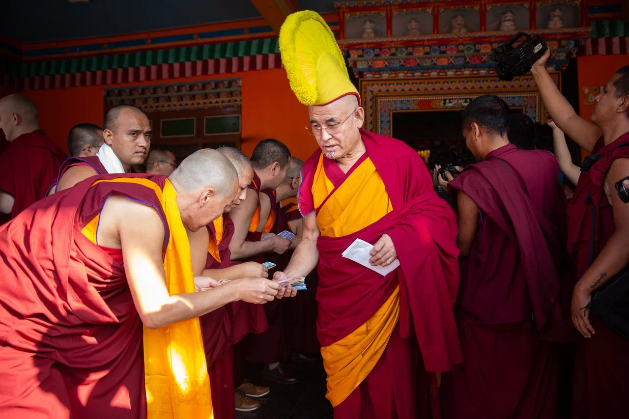 Под затяжные их молитвы Санал-гелюнг совместно с монахами Центрального хурула и верующими из Калмыкии, которые приехали поддержать и разделить с ним этот значимый день, сделали подношение всем монахам монастыря.