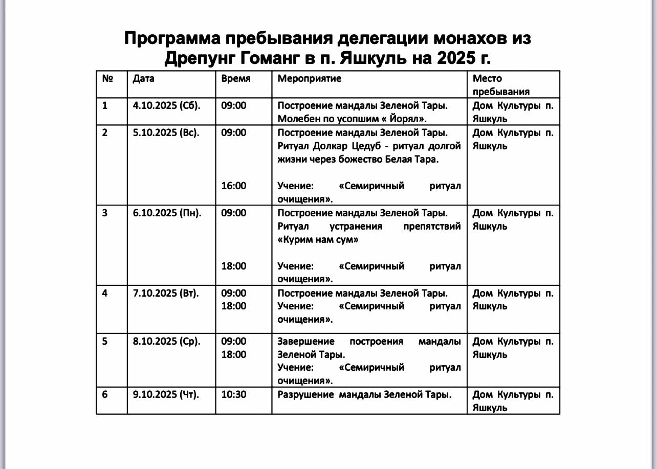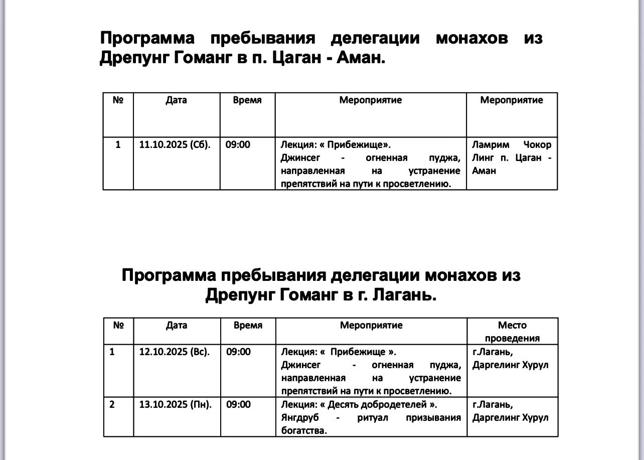 Здесь, в своем посте, мы прикрепляем полное расписание и по городу Элиста и по районам. И, конечно же, у местных жителей будет возможность получить наставления от досточтимого Сангпо Ринпоче.