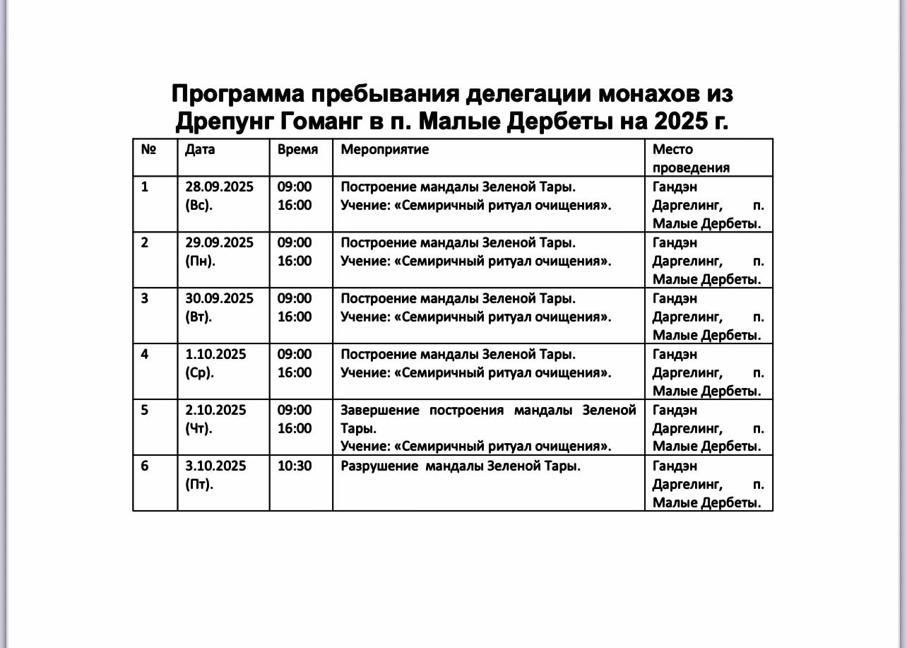 Также монахи из монастыря Дрепунг Гоманг проведут специальные обряды и построят мандалы в п. Кетченеры, п. Малые Дербеты, п. Яшкуль, п. Цаган-Аман и в г. Лагань.