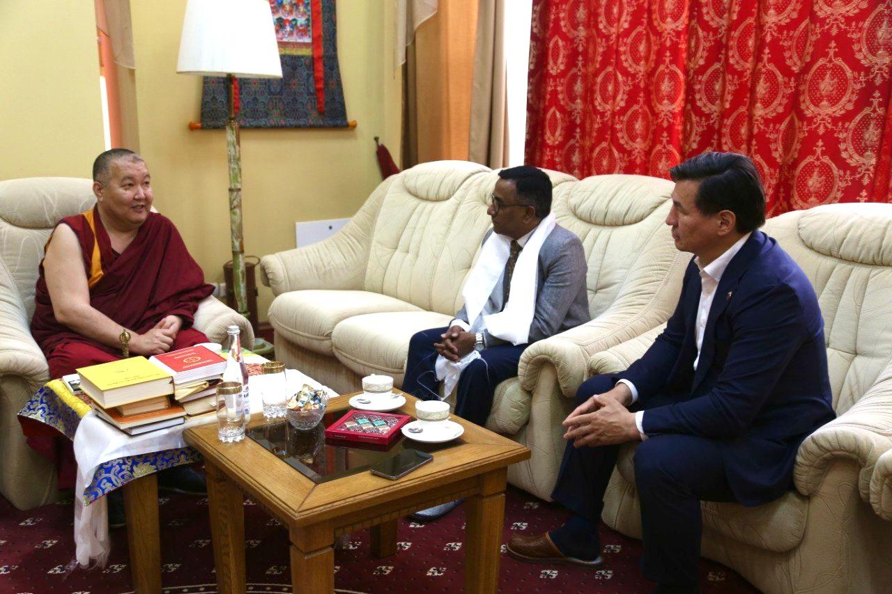 Геше Тензин Чойдак обращаясь к гостю, поблагодарил за такую возможность для калмыцкого народа созерцать святыню своими глазами, поклониться мощам Великого Учителя. В беседе Шаджин-лама рассказал о том, какую важную роль в его жизни занимает Индия, 16 лет он обучался на юге этой страны, в древнем монастыре-университете Дремунг Гоманг. «Кроме всех тех знаний к которым я стремился, которым обучился, и которые применяю в жизни, а также делюсь с земляками, очень много полезного я почерпнул просто общаясь с жителями Индии, почерпнул от индуской культуры», - вспоминая жизнь в монастыре, рассказал Шаджин-лама Калмыкии.