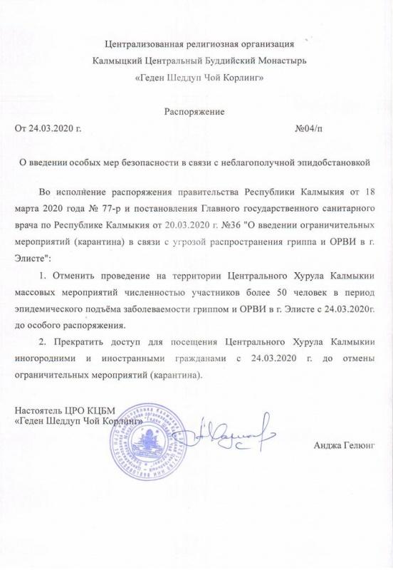 2. Прекратить доступ для посещения Центрального хурула Калмыкии иногородним и иностранным гражданам с 24.03.2020г. до отмены ограничительных мероприятий (карантина).