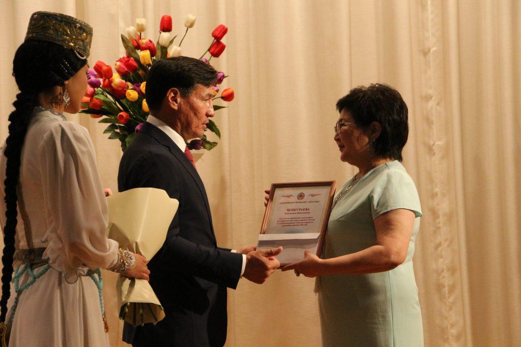 Кроме того, Глава Калмыкии Бату Хасиков вручил Почетные грамоты Республики Калмыкия, а также почетные звания заслуженного юриста, народного художника, заслуженного артиста и т.д.