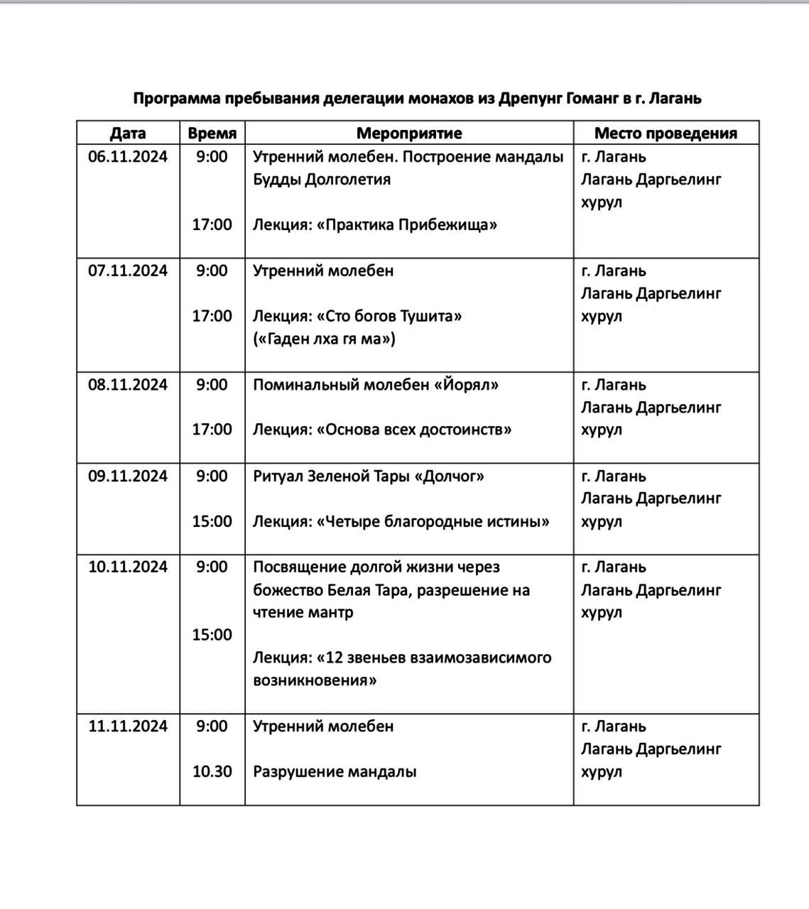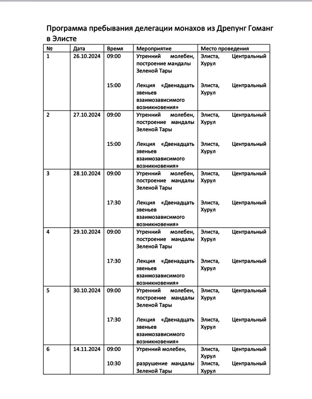 Также монахи из Индии проведут специальные обряды и построят мандалы в г. Лагань и в п. Цаган Аман. Здесь, в своем посте, мы прикрепляем полное расписание и по городу Элиста и по районам.